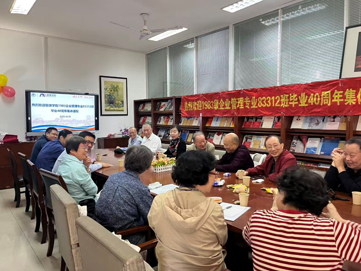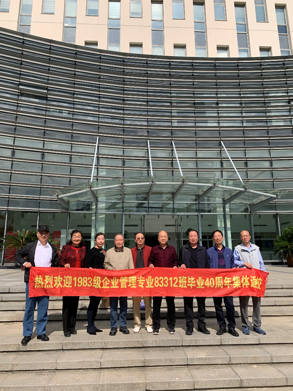 “菁”管起航——秩年校友班级集体返校。企业管理专业83312班相约毕业40周年再聚会,时任83312班辅导员顾惠云老师、康光毅老师和班主任陈明老师一起相聚。校友们深深感恩母校和老师们的培养,并对此次的热情接待表达感激。