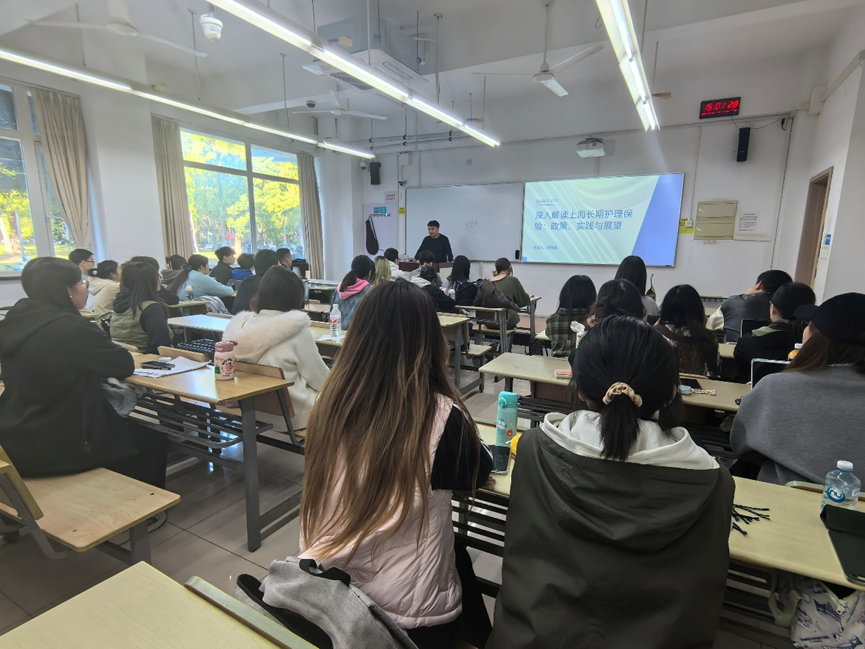 2025年11月5日,上海长护健康集团长护庙康护理站站长郑利坚(以下简称郑老师)应邀走进我校《社会保障基金管理》课堂,以《深入解读上海长期护理保险:政策、实践与展望》为题开展了专题讲座。